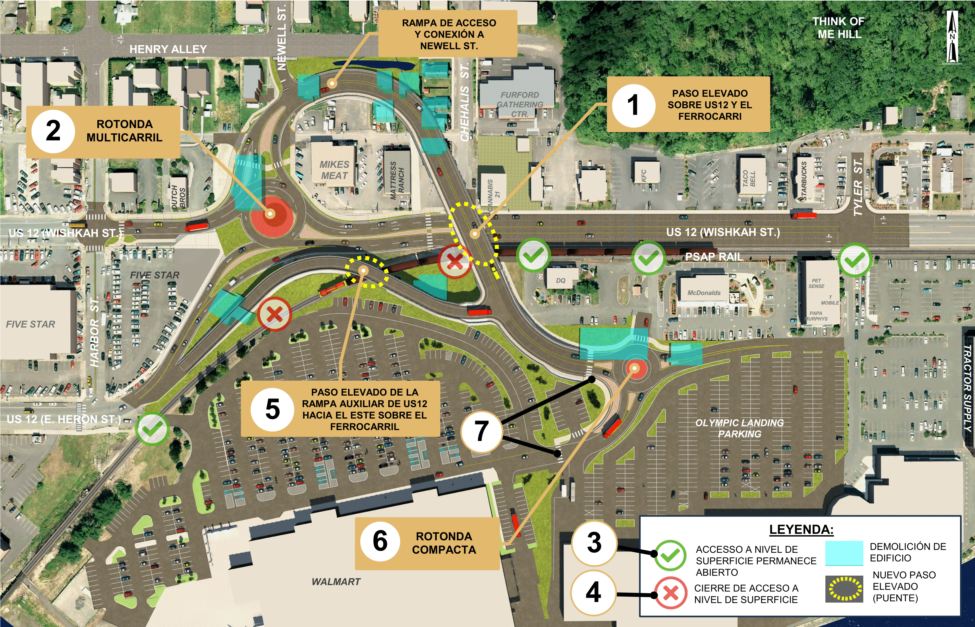 La alternativa preferida de paso a desnivel, seleccionada en 2015 y perfeccionada en 2021, identificaba la construcción de un paso elevado cerca de la intersección de la US 12 y Chehalis Street con una rotonda en Newell Street para dar cabida al movimiento vehicular entre la US 12, el nuevo paso elevado y las zonas al norte de la US 12 (véase la Figura 5).